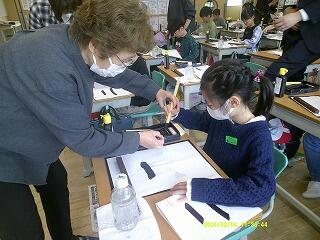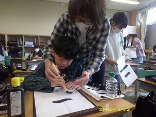3組の書写の時間に、書道連盟の先生方から、筆の持ち方や墨の含ませ方、筆の運び方など、一人一人に丁寧に教えていただきました。「もっと書きたい」という思いが広がり、集中して取り組む時間となりました。明日は1組、来週は2組でも学習を予定しています。