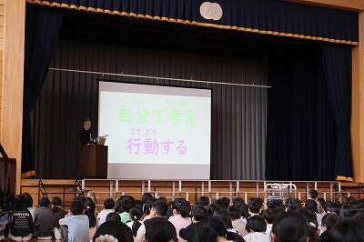 2~6年生が参加した全校朝会。校長先生から「しあわせになるヒケツ」についてのお話があり、「①やってみよう②ありがとう③なんとかなる④ありのままに」の考え方を知ることができました。これからの生活に役立てていきましょう。