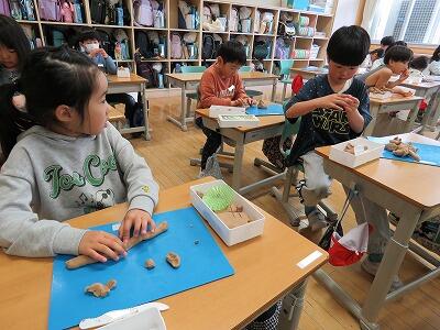 2年生の生活が始まりました。図工では、粘土を握ってできる形をもとに作品を作りました。体育では遊具を使ったり、曲がったコースを走ったりしました。