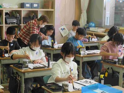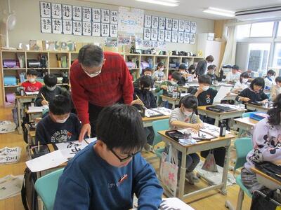 16日(火)4年生は書道の学習を行いました。書道連盟より講師の方をお招きし、きれいに書くコツを教えていただきました。新年書初め会に向けて一生懸命練習できました。