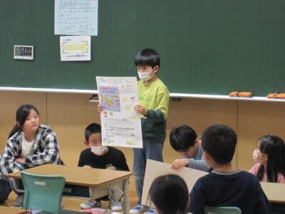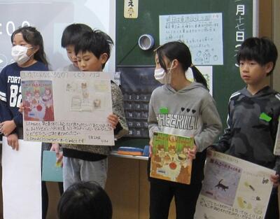 学習のまとめに、本を紹介するポスターを作って1年生に紹介しました。「楽しそう!」「早く読みたい!」という1年生のキラキラしたまなざしを受け、嬉しそうな様子の子どもたちでした。