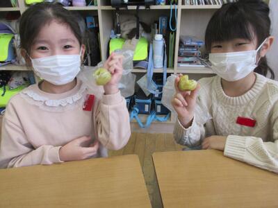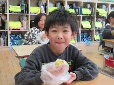 以前収穫したさつまいもで茶巾絞りを作りました。まん丸やハートの形など、自分の好きな形にして、みんなでおいしくいただきました。自分たちで収穫したさつまいもは、甘くてほくほくしていました。家族に食べてもらいたい!というくらい大満足の1年生でした。