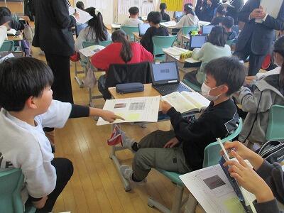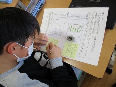 1. 5年 国語授業研究会の様子 投稿: 大森小学校-1 (11/12) 北村山地区教育研究会で5年1組の国語の授業を見てもらいました。自然環境を守るために、一人ひとりがテーマを選び、自分の考えを伝えるための意見文を書きました。子どもたちが一生懸命資料から分かったことをまとめたり、書いたことを交流したりする姿に多くの先生方が感心していました。緊張の中、1組のみなさんよくがんばりました。 3