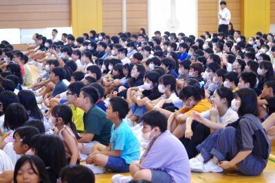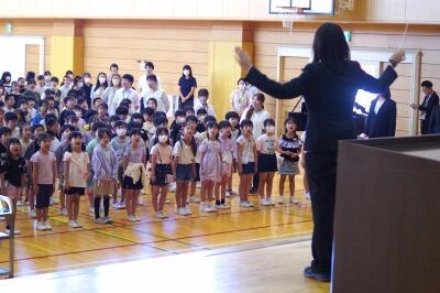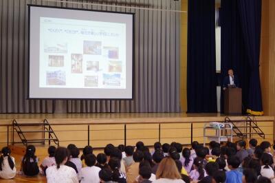 9月10日(火) 創立記念式を行いました。児童代表のことばでは、6年生が大森小の好きなところを2つ紹介してくれました。ひとつ目は学年、男女問わずみんなが仲良く遊んでいること、2つ目は、きれいで明るい校舎のことです。校長先生の式辞では、14年前に大森小学校が建設された当時のいきさつのお話があり、その後、建設当時から現在まで、大森小を担当してくださっている「前田建設工業」の方より、大森小の校舎建設にかかわるお話をしていただきました。子どもたちは、自分たちが学んでいる校舎やグラウンドの中に、建設をしてくださった方々の思いや様々な秘密が隠されていたことを知り、ますます大森小学校が大好きになったようでした。