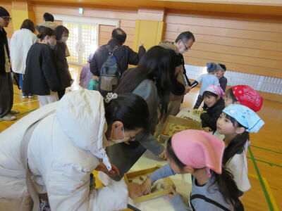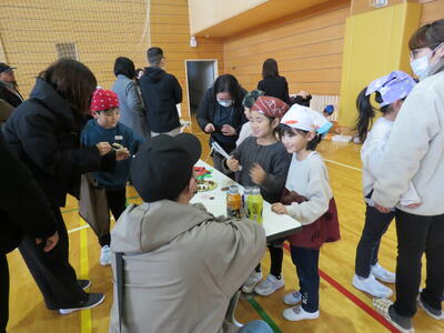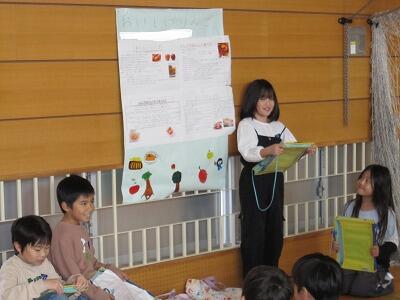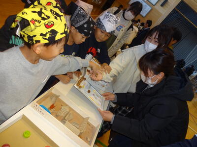 12月3日(火)に1年生の学習発表会『あきまつり』を行いました。自然の家や家の周りで拾ってきた木の実や落ち葉を使って、様々な遊びや飾りをつくりました。本番ではお店屋さんになりきって、お客さんを楽しませることができました。