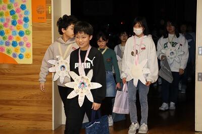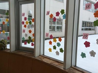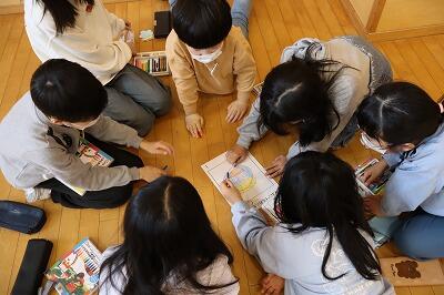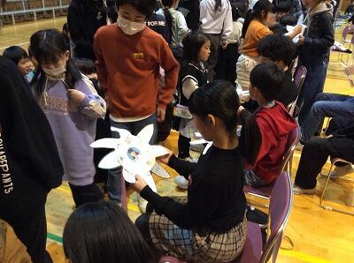 今年度最後のなかよしの日の活動は「‘オリジナルおに’をつくろう」「681人の花をさかせよう~学年のわくをこえて~」です。班のメンバーで、おにの顔のパーツ(目、鼻、口…)を1つずつ書いていき、自分たちの「おに」を完成させます。最後に、おにのなまえ「〇〇おに」をつけました。その後、学年カラーの花の色紙に全員が「ありがとうメッセージ」を書きました。廊下には個性豊かな「オリジナルおに」が勢ぞろいしました。光のストリートのガラスには、各班の「ありがとうメッセージ」の花が咲き、その前を通ると心が温かくなりました。