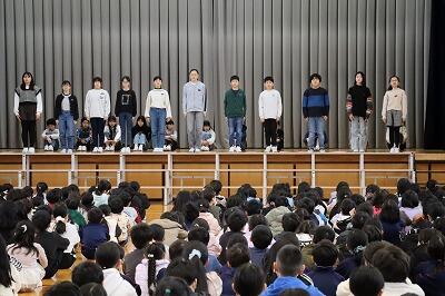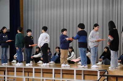 きょうは6年生に感謝の気持ちを伝える「6年生を送る会」でした。1~4年生からのビデオメッセージ、5年生が企画・制作した6年生各クラスの紹介、6年生クイズで楽しみました。その後なかよし班の班長さんにお礼のメッセージ付きメダルを渡し、ありがとうの気持ちを伝えました。6年生からは在校生に向けてのメッセージとすてきな合唱があり、感動の空気が流れ、たくさんの「ありがとうの花」が咲きました。6年生とのお別れまで約1か月。思い出をひとつずつきざみながら、残りの日々を過ごしていきます。